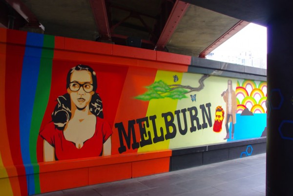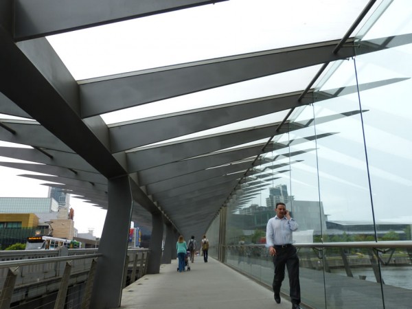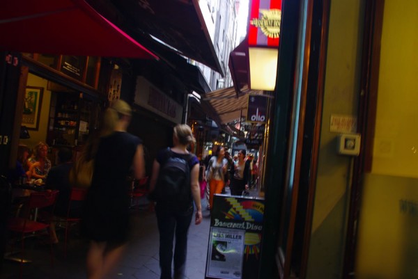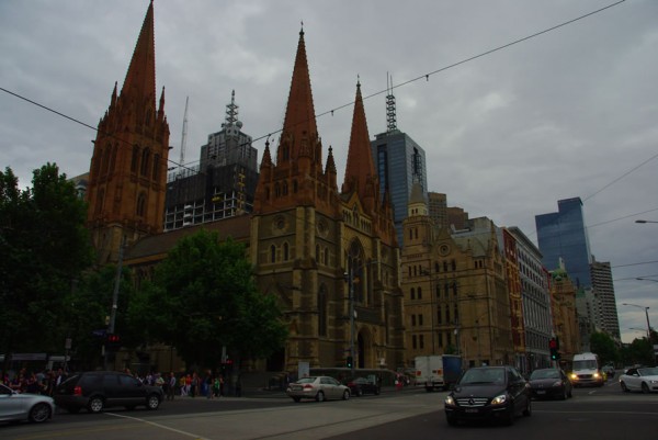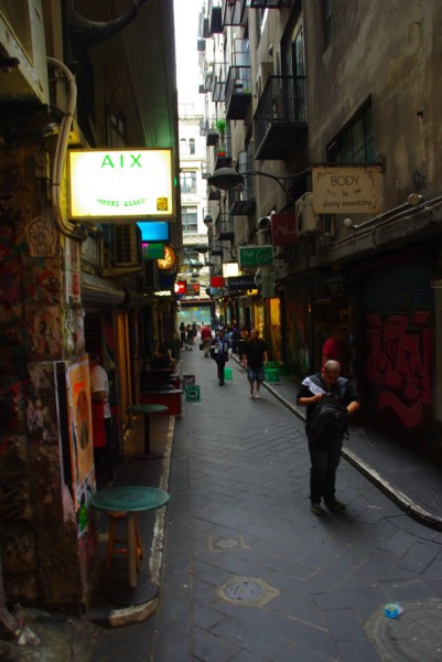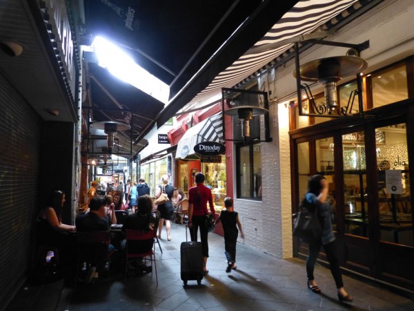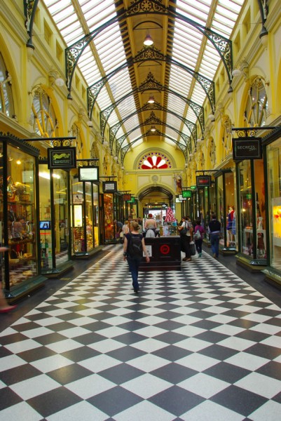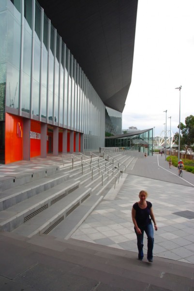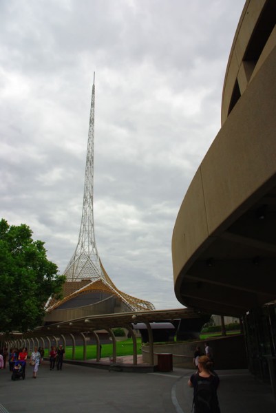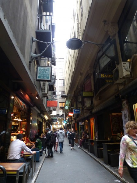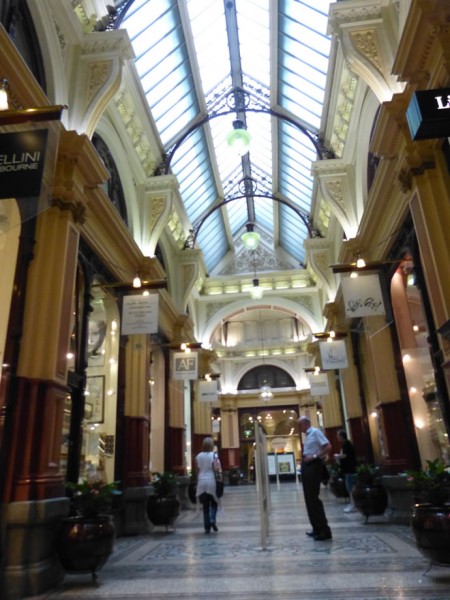 Après un dej’ près du web bridge, à base de burger frites pour Virginie et de gambas aux asperges crues pour moi avec des morceaux de citron dedans… (why but why ???) on est reparties vers le centre de Melbourne via le Melbourne Convention Centre, impressionnant. A cette occasion nous avons découvert des ruelles étonnantes où sont concentrés cafés et restaurants dans un univers un peu glauque mais underground : on va dire underglauque 🙂 Nous avons traversé des passages couverts plus chic et glamour à l’ambiance « européenne fin 19ème», pour rejoindre le cœur de Melbourne sur Bourke street.