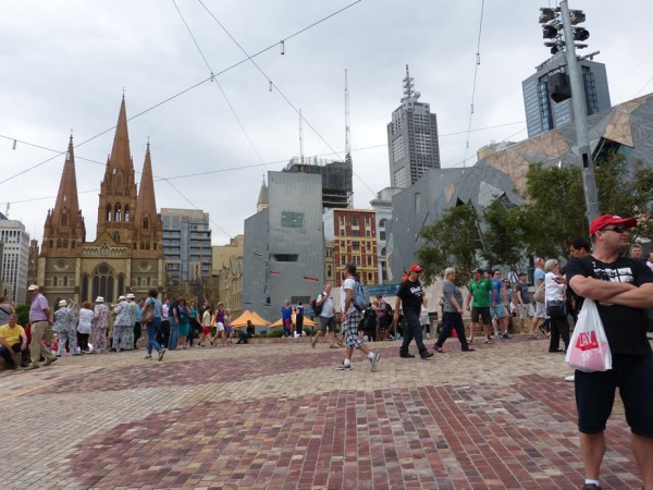 Aujourd’hui, nous avons attaqué Melbourne par la face sud. Nous avons descendu Flinders street jusqu’à federation square où il y avait une manifestation en prévision de la Melbourne Cup où défilaient en voiture les jockeys et les entraîneurs de chaque cheval. Quand les favoris passaient, la foule acclamait soit l’entraîneur soit le jockey qui répondait par un signe de la main façon reine d’Angleterre. En parlant de reine, le prince de Galles et Camilla ont fait spécialement le déplacement.