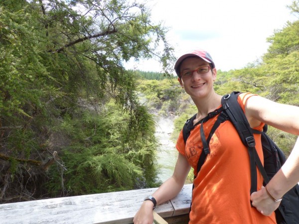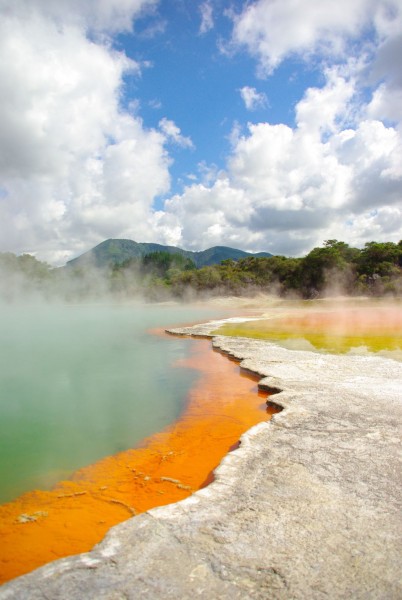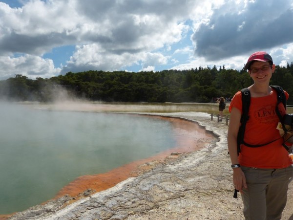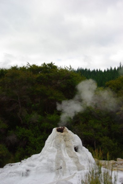 Aujourd’hui, nous en avons encore pris plein la vue ! Hier, nous étions dans la Bay of Plenty, dans notre camping super laid. Ce matin, nous avons pris la route pour Rotorua, ville qui jouxte le lac du même nom. C’est un endroit très touristique pour plusieurs raisons : on y trouve la plus grande concentration de maoris, il y a donc plusieurs villages dans lesquels vous pouvez aller assister à des hakas ou manger un « hangi » (j’y reviendrai) et c’est aussi la région ou l’on peut observer l’activité volcanique au travers des geysers, des paysages lunaires, des spa naturels d’eau bouillantes ou des « mud pools » (bains de boue naturels dans des cratères). Bref, ça vaut le détour !