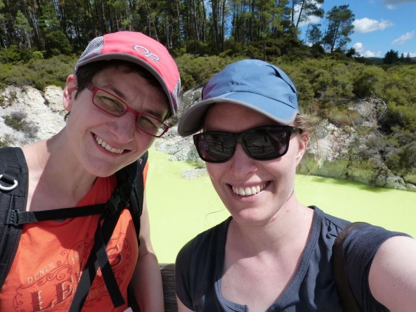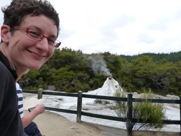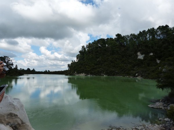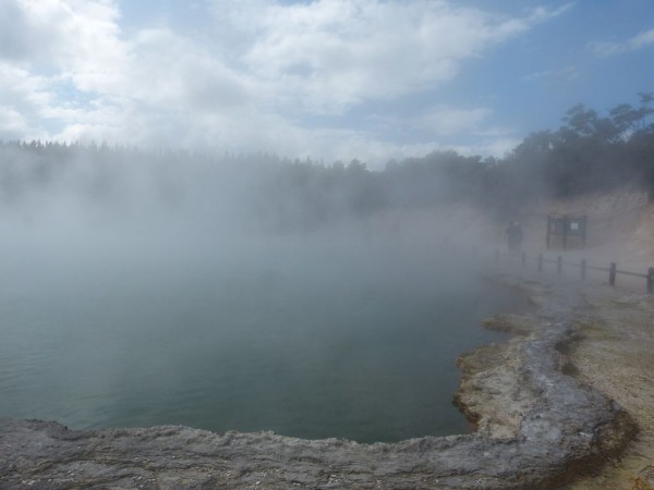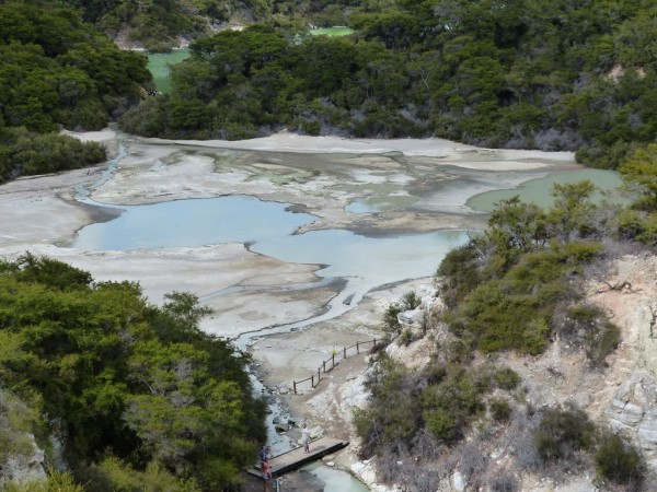 Ce matin, nous sommes allées à Wai-to-pu, voir les geysers, les cratères, les lacs couleur ocre, jaune, vert, les étendues de silice blanc, bref, des paysages qu’on ne voit qu’à quelques endroits de la Terre. Difficile à décrire, voyez plutôt les photos 😉 Niveau touristes, si jusqu’alors nous étions assez tranquilles, on sent bien ici que l’endroit est très couru 😉