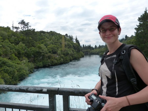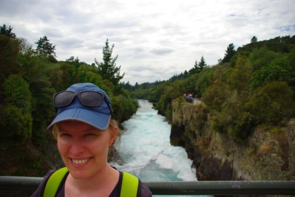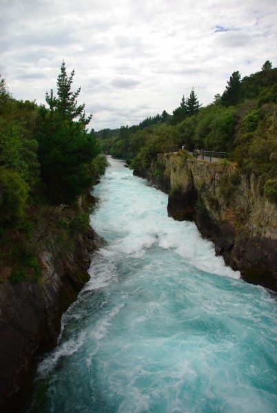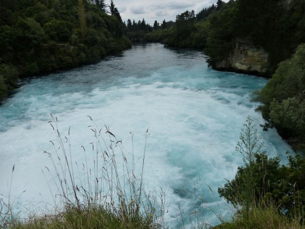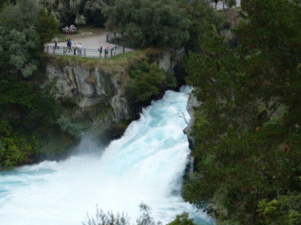 Départ pour les huka falls. Des chutes d’eau impressionnantes mais pas trop quand même : ) vu que l’on a pas arrêté d’en entendre parler on s’est figuré les chutes du Niagara. Bon on en est loin mais c’est quand même impressionnant la force des rapides et les eaux turquoises !